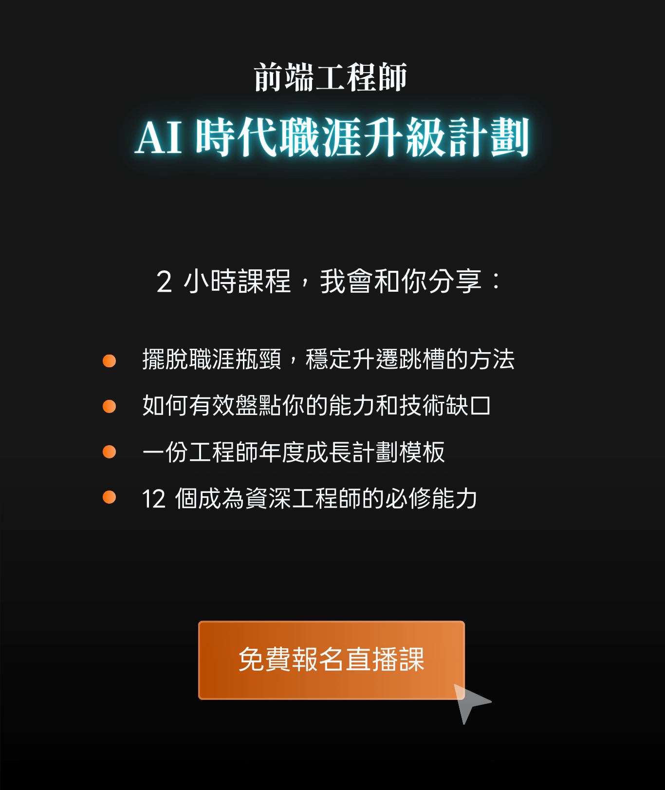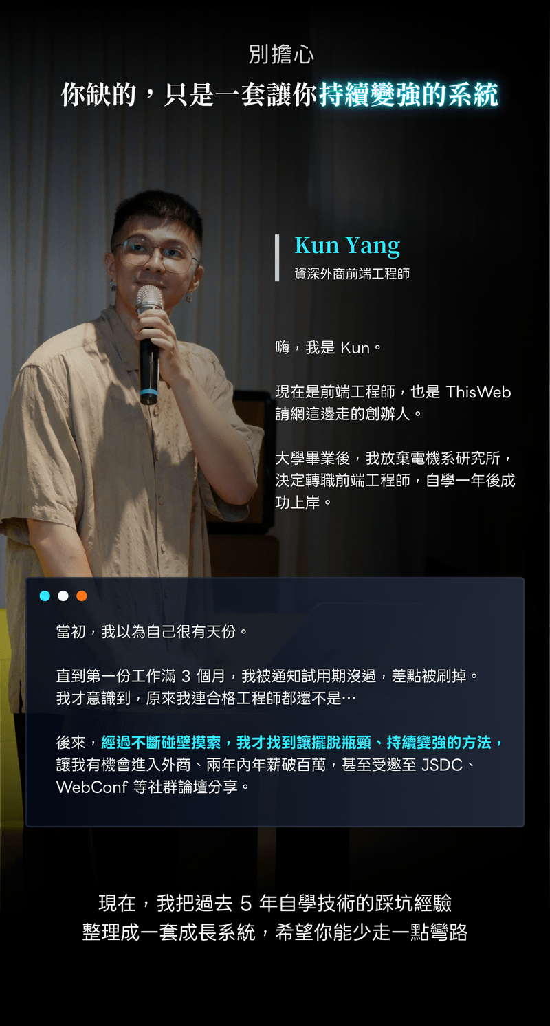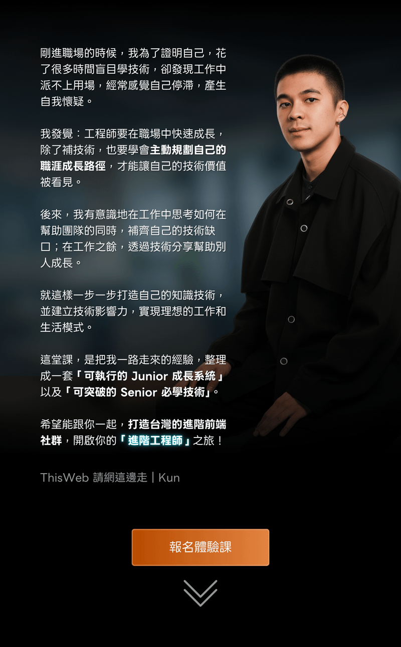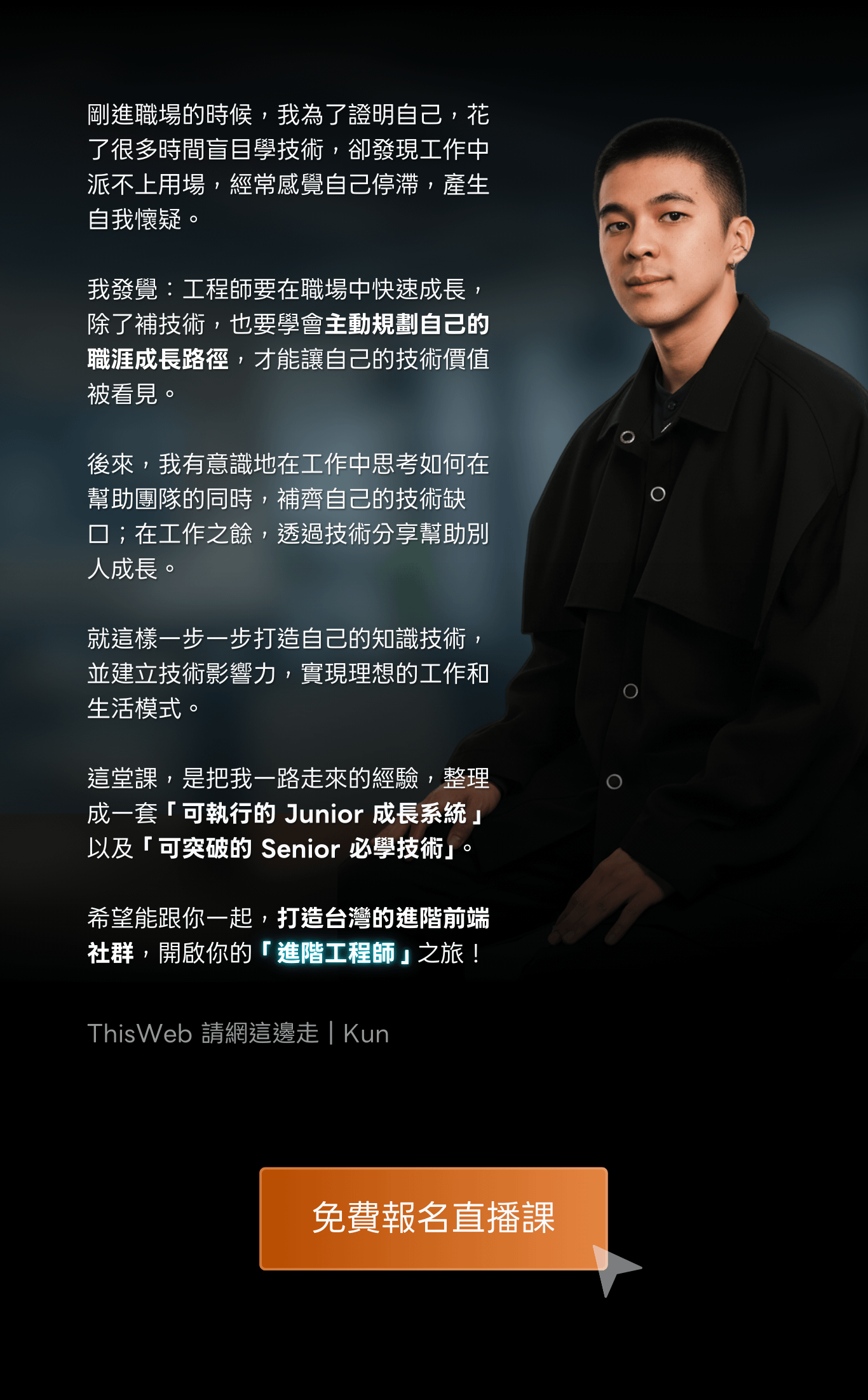 曾任外商品牌設計公司資深前端工程師,期間創立前端教育品牌 ThisWeb,分享技術教學與職涯經驗,經營 3 年發表 200 多篇內容、社群累積超過 2 萬追蹤,並受邀至 JSDC、WebConf 2025 擔任講師。